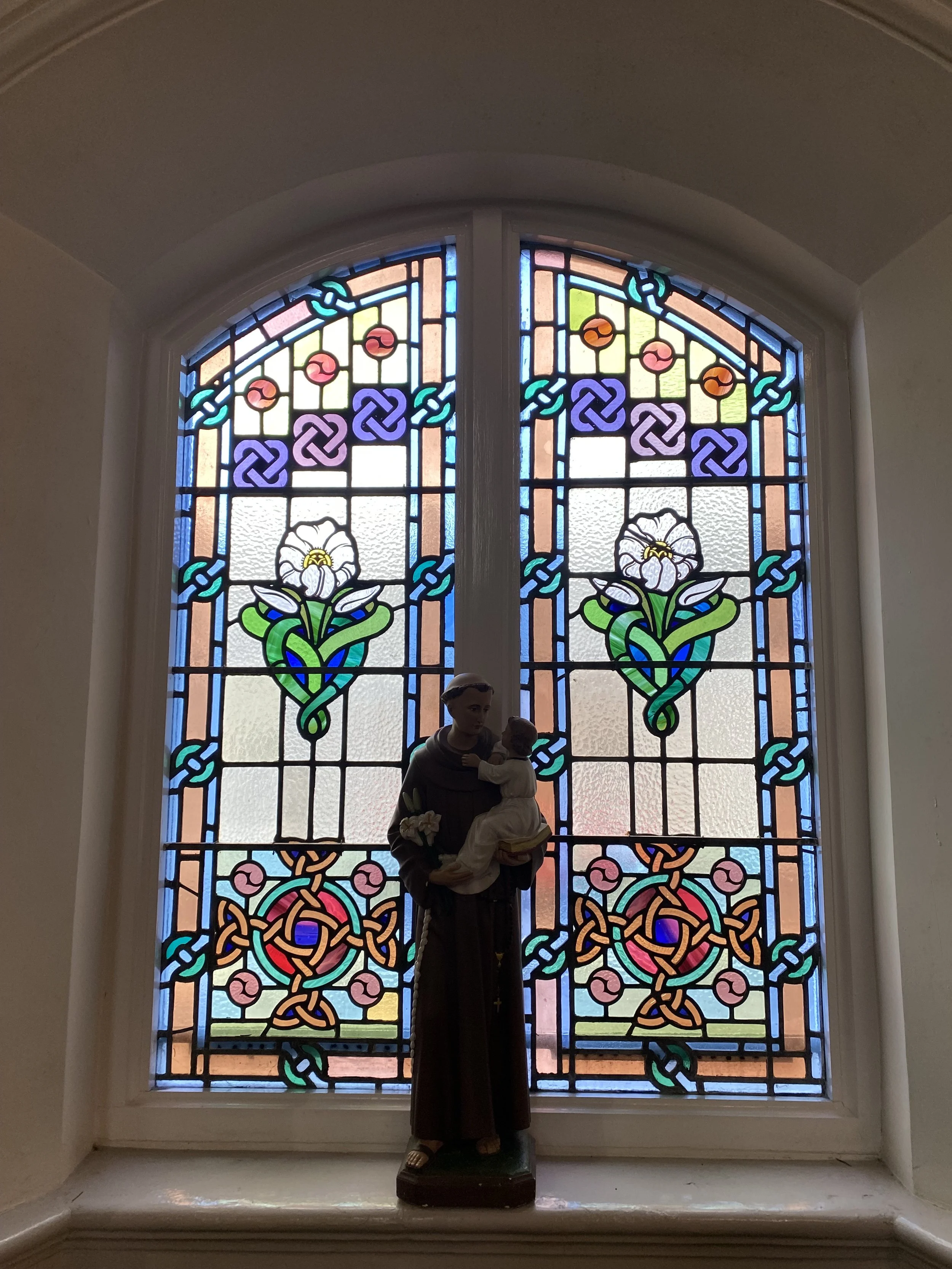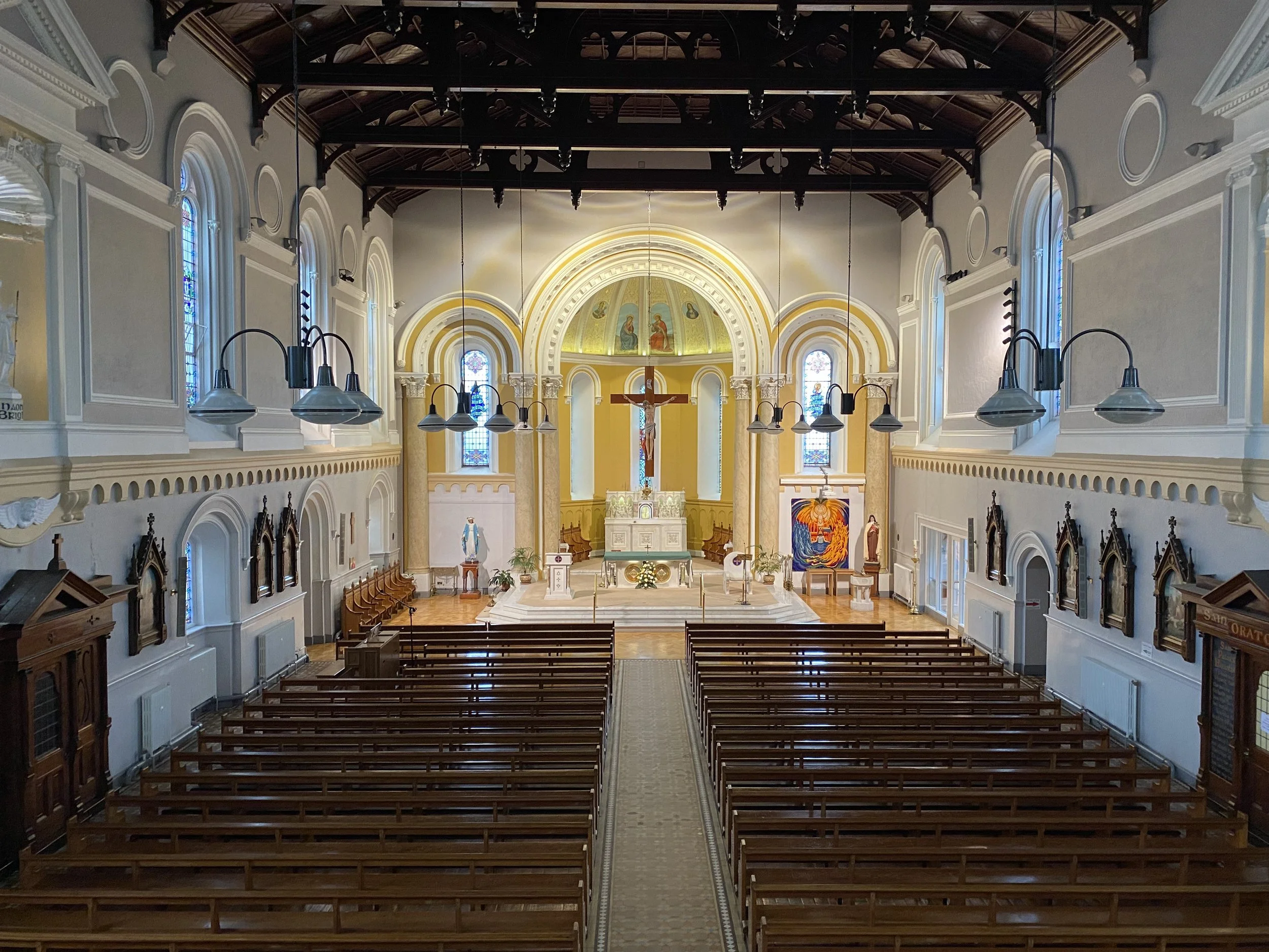 The stained glass window was drawn by Maurice Harron and made by Art Glass in Derry.