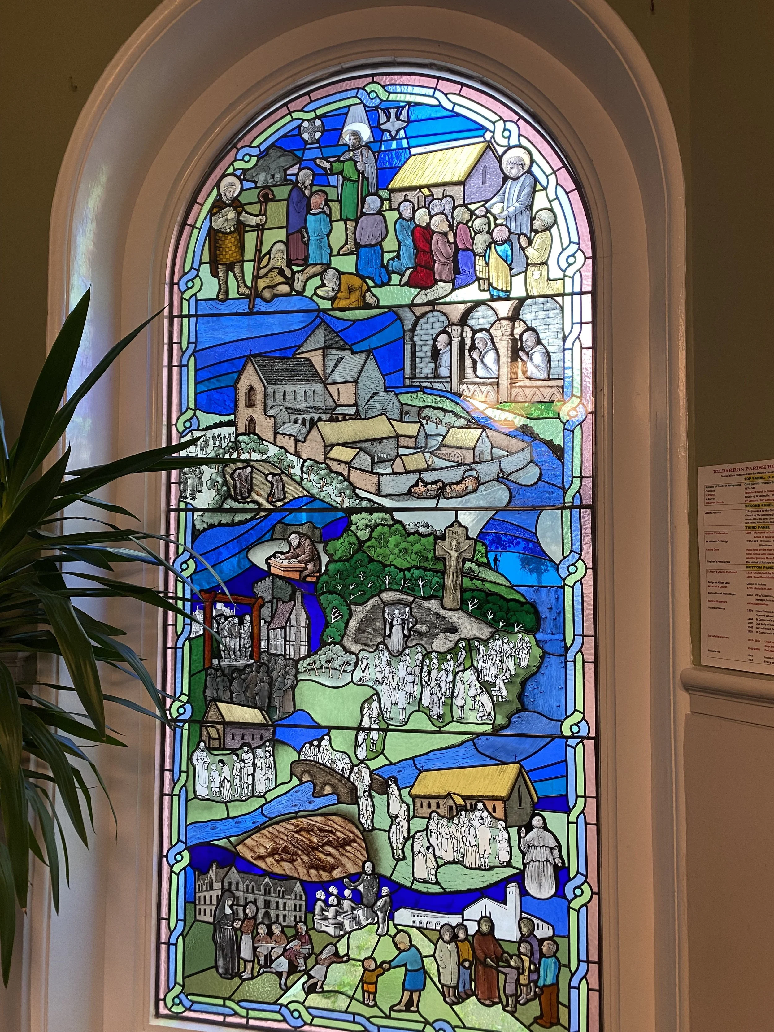 The Kilbarron Parish History window found in the entrance of St. Patricks Church, Ballyshannon.